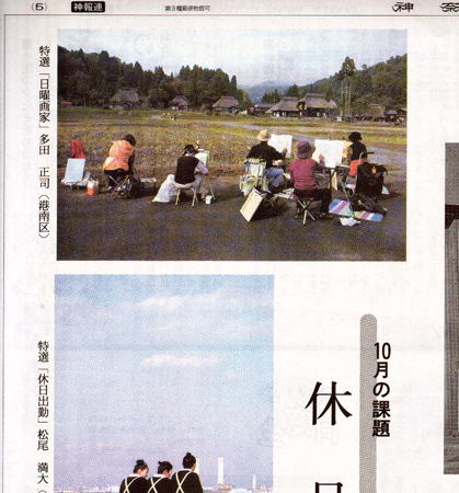 点々と並ぶ、かやぶきの民家と写生する日曜画家の並び方にリズム感がある。周囲を十分に取り込んだ構図で、ゆったりした時間の流れを感じる。